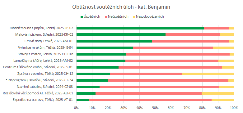 Čísla ukazují, že letos byl test dost těžký pro Benjaminy. Jinak podíl úspěšných s věkem klesá, což odpovídá naší představě, že pro mladší věkové ročníky má být soutěž spíše motivační a pro starší výkonnostní.