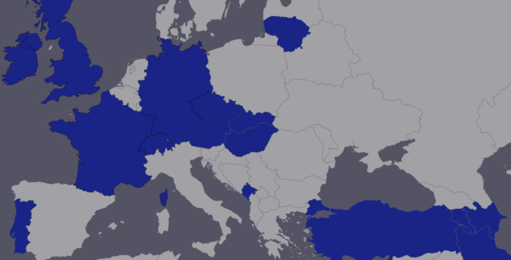 Na horní mapě jsou tyto země obarveny modře, na dolní mapě je zvětšená Evropa a okolí.