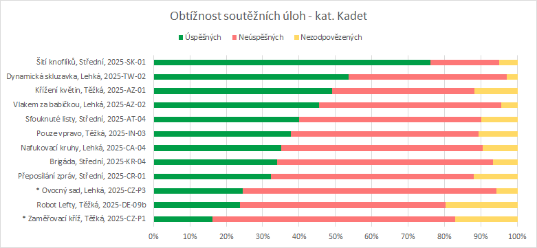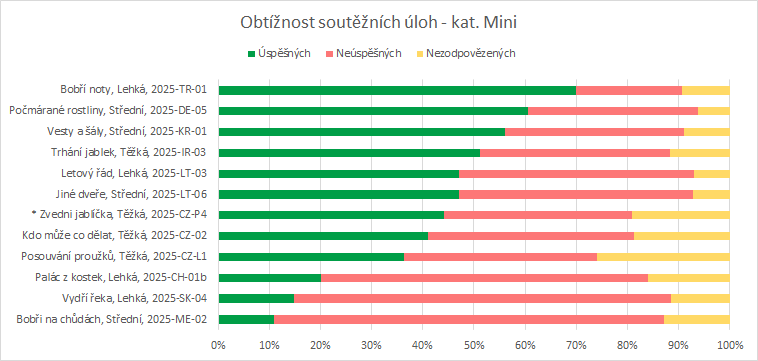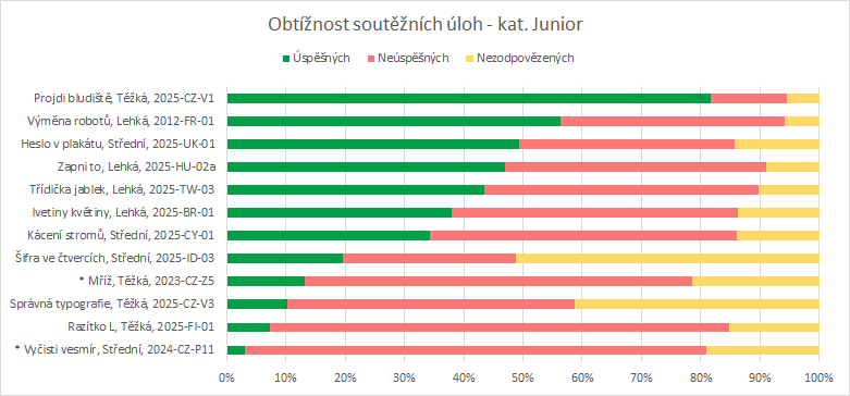 Úspěšnost soutěžících u jednotlivých úloh uvádíme po kategoriích. Otázky jsou seřazeny podle podílu správných odpovědí.