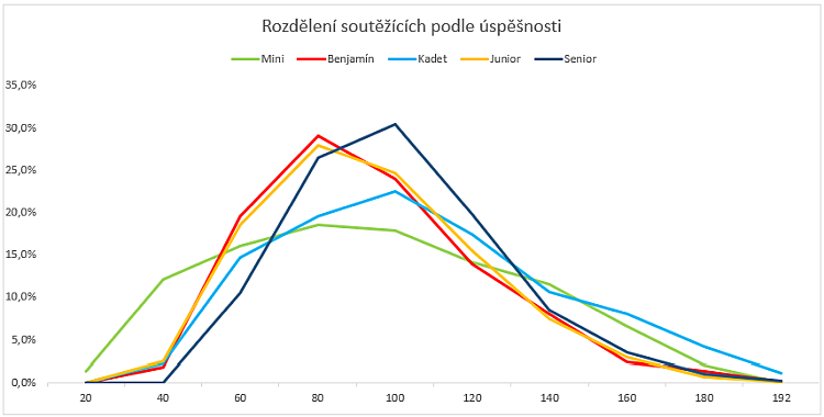 Kategorie Benjamin a Junior mají posunutou špičku směrem k nule, ukazuje to na relativně těžké úlohy.