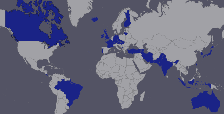 1 z Austrálie, Finska, Francie, Indie, Indonésie, Íránu, Irska, Islandu, Japonska, Maďarska, Kanady, Kostariky, Kypru, Pákistánu, Portugalska, Turecka a Velké Británie.