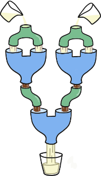 - Když Kuba spojí dva takové stroje za sebe a nalije do obou tunelů čokoládu, do sklenice vyteče opět čokoláda (obrázek níže).