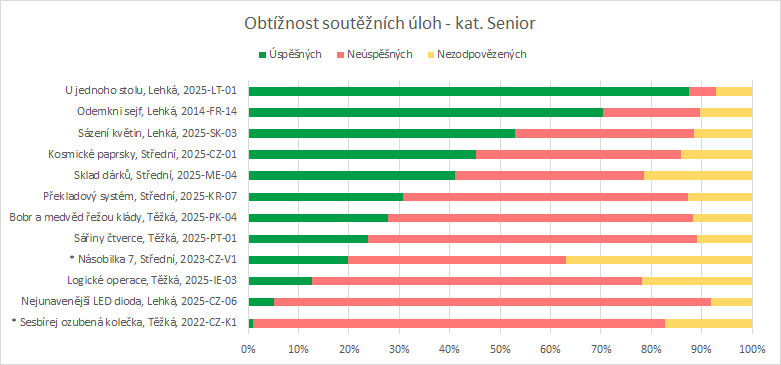 Úspěšnost soutěžících u jednotlivých úloh uvádíme po kategoriích. Otázky jsou seřazeny podle podílu správných odpovědí.